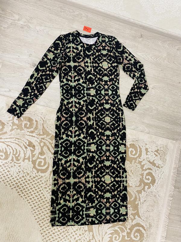 Стильна сукня. Красивий принт. Нова. Знизу по бокам розрізи ( на 25 см). Тканина добре тягнеться. Можна як на повсякдення, так і на свято. Розмір S, але можна і на невелику М. Заміри: довжина- 118 см, плечі- 34 см, по грудях- 40 см, по талії- 37 см, по бедрам- 43 см, рукав від плеча- 58 см. Тканина дуже добре тягнеться.