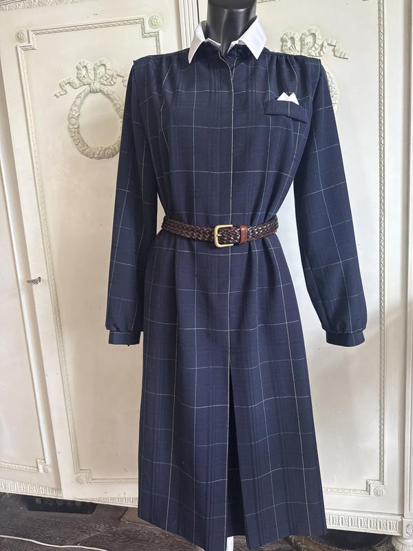 Якісна вінтажна сукня міді. Склад:вовна/поліестер(45/55). Білий комірець знімається(на тоненьких кнопках). На підкладці по всій довжині. Розмір по бірці-42. Заміри: довжина-110 см, ПОГ-50 см, ПоБ-54 см, рукав-61 см, ширина в плечах-41 см. Стан ідеальний.