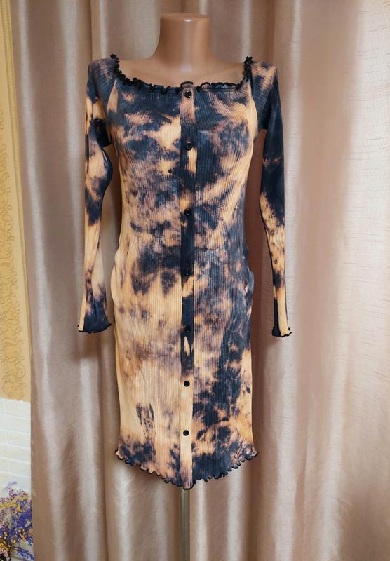Стильное, в необычное окрашивание, красивое платье в рубчик. Линия плеча регулируется, по бокам в области талии есть корректирующие резинки, спереди имитация пуговиц. Ткань натуральная как резинка хорошо тянется. Длина 86см, пог 45см, пот 40см, после 43см, рукав от плеча 58см.