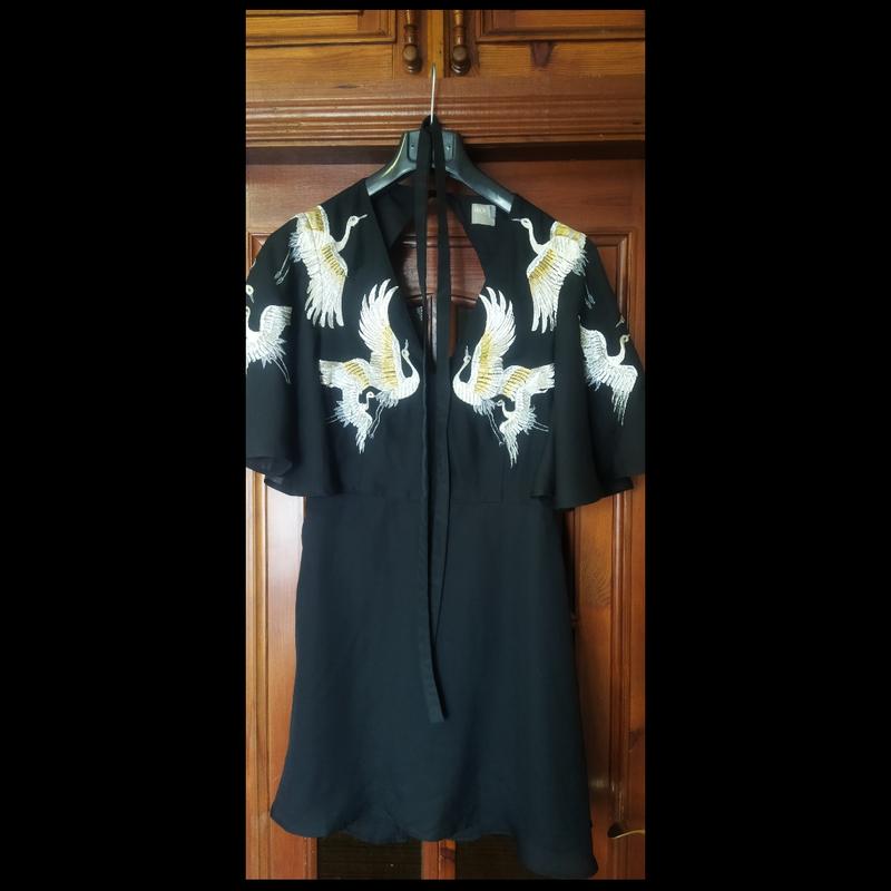 платье с журавлями,е подкладка, имеет пасок,спина открытая,на размер м или л, если надо замеры сделать