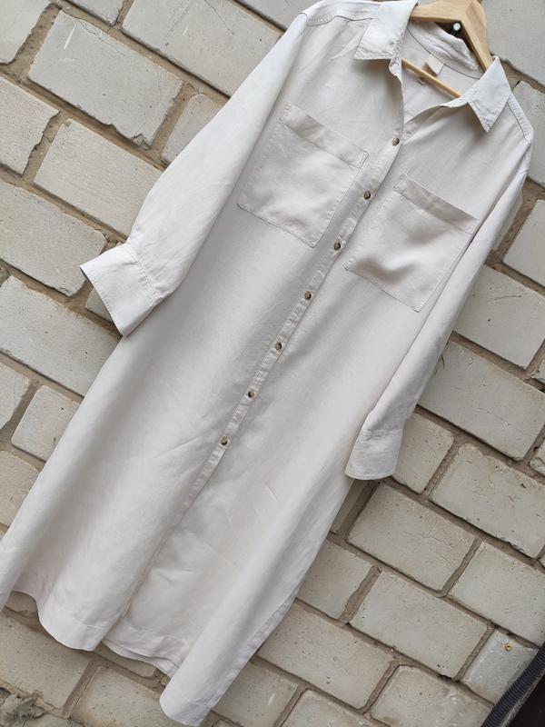 В новом состоянии. Это платье оверсайз изготовлено из легкого и дышащего льна насыщенного бежевого- серого оттенка. Длина - 125 см Пог - 70.5 см Плечи - 52 см Рукав - 57 см