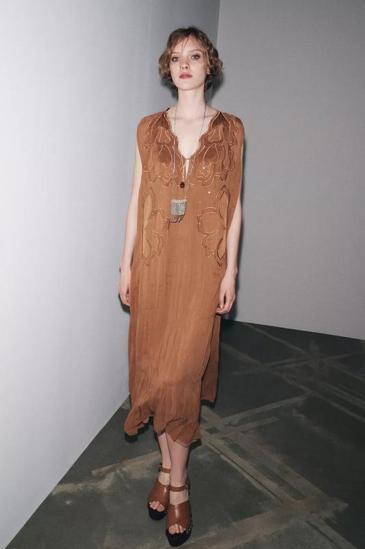 ZARA WOMAN COLLECTION Сукня міді з віскозної пряжі. Круглий виріз горловини та пройми без рукавів. Тканина зі зборками та вишивкою в тон. ІРИСКОВИЙ | 5107/271/745