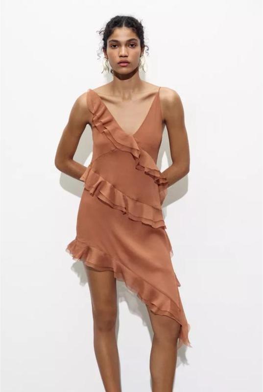 Сукня з v-подібним коміром і тонкими бретелями. Волани з тієї ж тканини та асиметричний низ. ІРИСКОВИЙ | 1067/157/745