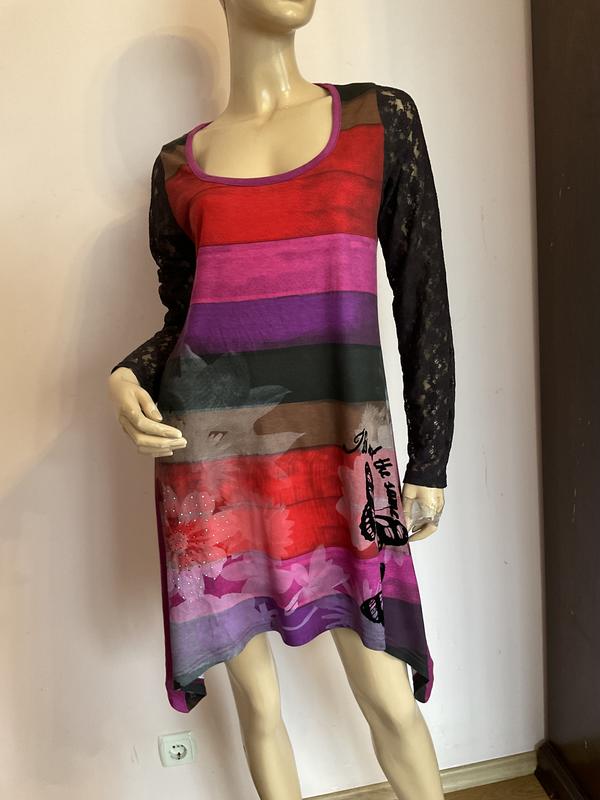 Известный испанский бренд, бабочка напыления замшей. Асимметричный Низ, рукава гипюр. Без дефектов. Без подкладки. Тянется. Замеры груди 48 см в талии 42 см в бедрах 52 см длина по боку 93 см по центру 84 см рукав 64 см, в плечах 36 см 15:9:25
