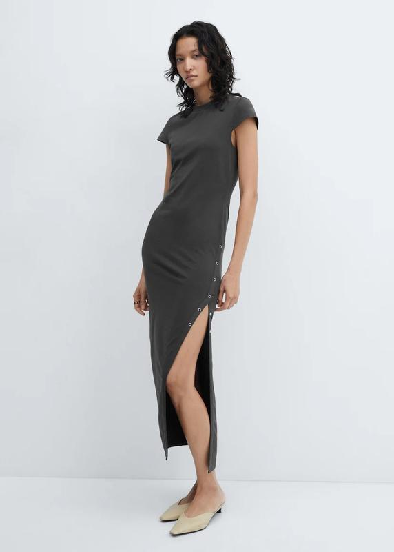 Mango Нове, з офіційного сайту Прямий крій. Міді довжина. Круглий комір. Короткі рукави. Без застібки. Бічний розріз. Бічні кнопки( 4 верхні-декор, 2 знизу функціональні). Приталений крій, тягнеться В наявності XS розмір 92% бавовна, 8% еластан