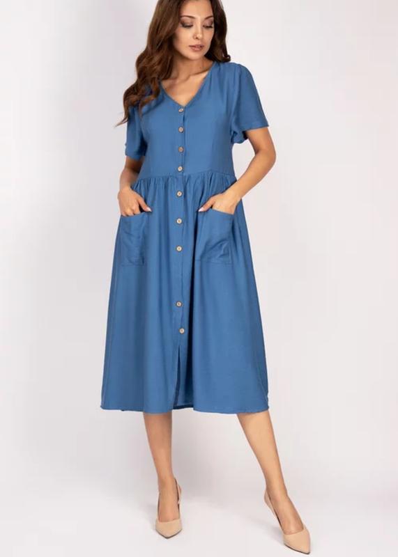 Платье миди с V образным вырезом горловины. Застежка на пуговицы по всей длине, передние накладные карманы