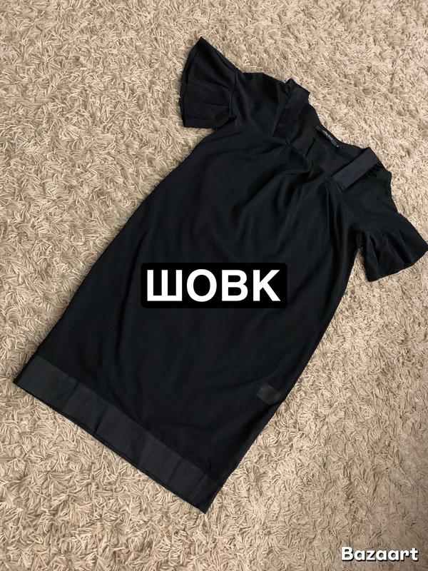 Talking French. Ідеальний стан. Колір чорний. Матеріал - напівпрозорий шифон, майже не тягнеться. 97% шовк 3% еластан. Низ та горловина оздоблені широкою атласною стрічкою. Маркований розмір 38 EU. Заміри на фото.