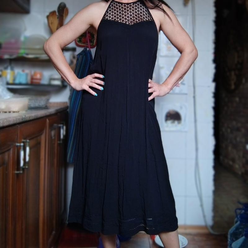 Черное платье из вискоза с прикольной сеточкой спереди с открытой спиной.Есть вставки под ремешок