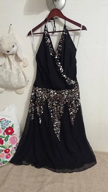 В безупречном состоянии, очень праздничная и изысканная. Все показала на фото. Размер - 14. Талия - 45, подмышками не пишу, потому что там впереди и спинка - запАх. Бедра - свободно, длина от талии ( юбочки) 65, верх регулируется.