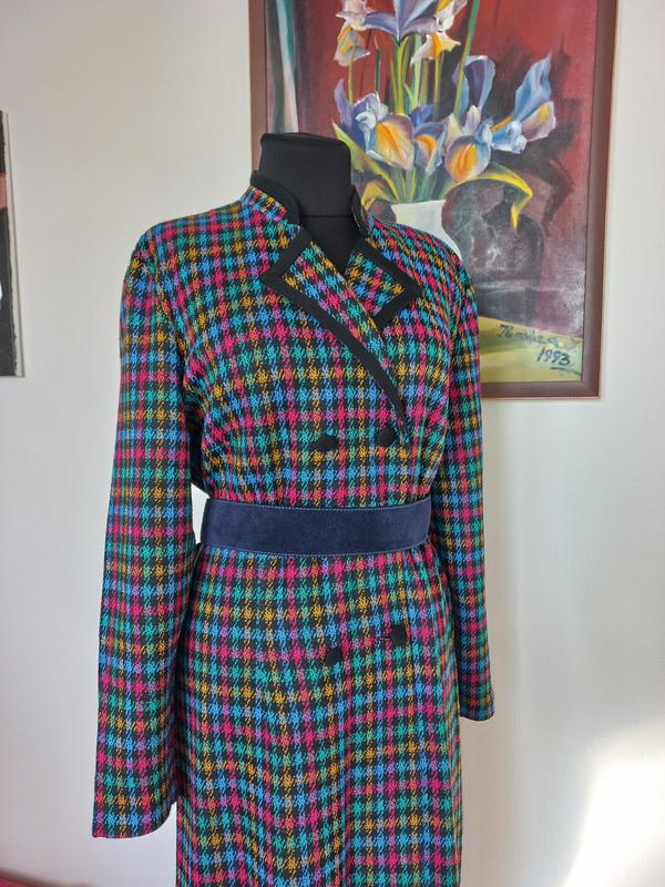 Симпатичное винтажное платье миди в гусиную лапку. Размер XL/ L. Платье без подкладки. Трикотаж достаточно плотный, не "всплывающий". Предусматривается прилегающий силуэт, но можно взять на меньший размер для более свободной посадки. В комплекте родной поясок. Стан идеален. Замеры: Плечи: 43 см Рукав по зовн.шву: 56 см Полуобхват груди: 57 см Полуобхват талии: 52 см Полуобхват бедер: 56 cм Длина по спинке: 108 см + 3 см воротничок. Выполнена из 100% акрила.