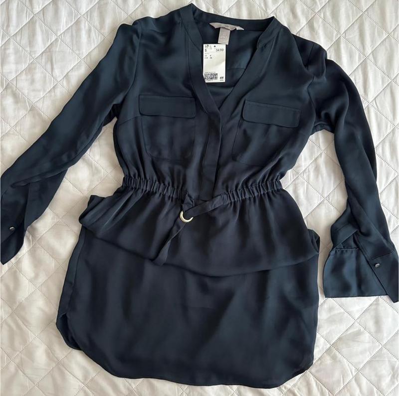 Сукня з тоненької тканини на підкладі на розмір XS-S в темно-синьому кольорі. Два кармани на грудях і резинка на поясі Класно в офіс На підкладці