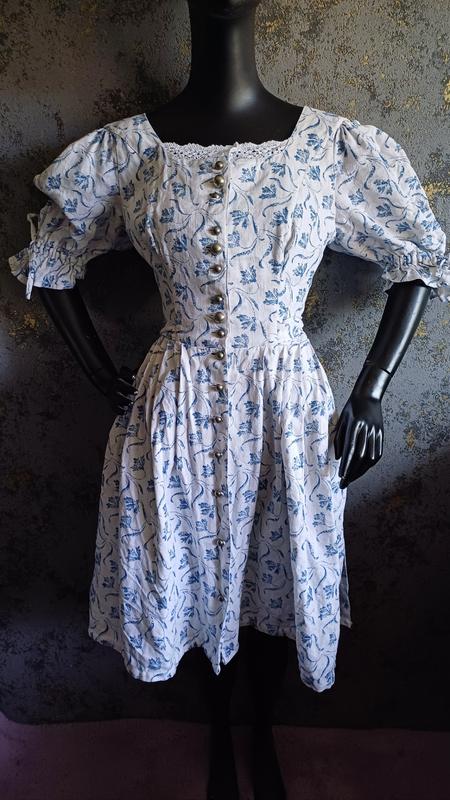 Платье из натуральной ткани, информации о составе на бирке не указано, или хлопок или лен, возможно и то и то, ткань плотная. Застегивается на металлические пуговицы, пояс притачной, в боковых швах есть карманы, подкладка на лифе платья.
