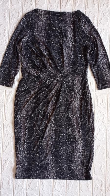 Платье женское с принтом рептилии Autograph Размер 14. Рукав 3/4. Тканина: 95 % - поліестр, 5% - еластан. Это трикотажное полотно на основе полиэстра с добавлением эластана для эластичности ткани. Подкладочная ткань из вискозы 96%, с добавлением эластана 4%. Очень приятная к телу, мягкая, хорошо тянется. Платье отлично садится по фигуре. Замеры: Ширина у плечах - 40 см Полуобхват груди - 48 см Полуобхват талии - 40 см Полуобхват бедер - 52 см Напиобхват по низу изделия - 46 см Длина изделия - 101 см Длина рукава - 46 см