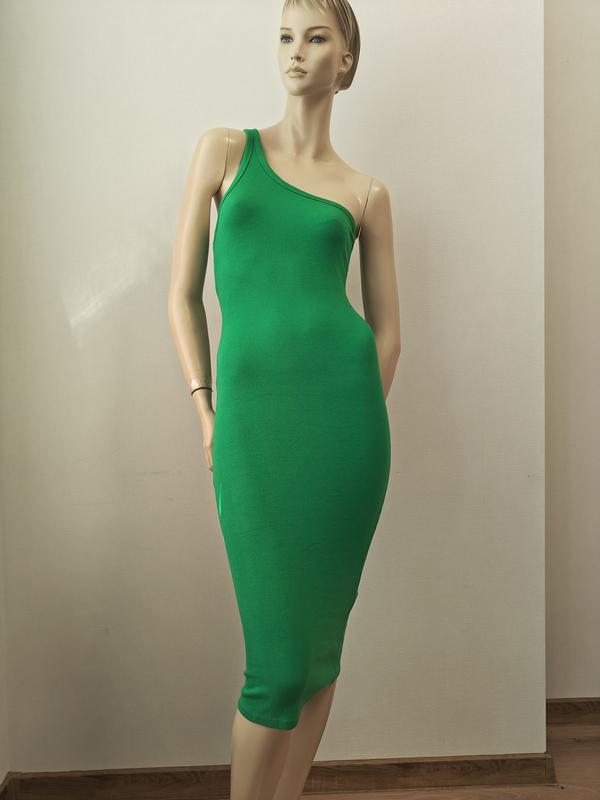 Красивое платье по фигуре в рубчик, плотное. Астметричный верх. Выглядит одновременно и лаконично, и довольно эффектно. Новая, без бумажной бирки. ХС-С. Длина в "споком" состоянии 108 см