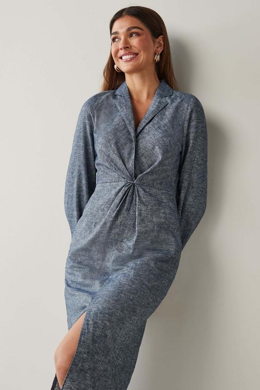 Сукня жіноча міді синього кольору. У складі 52% льону та 48% котону.. Верх як сукня-піджак, попереду розріз. Колекція Petite