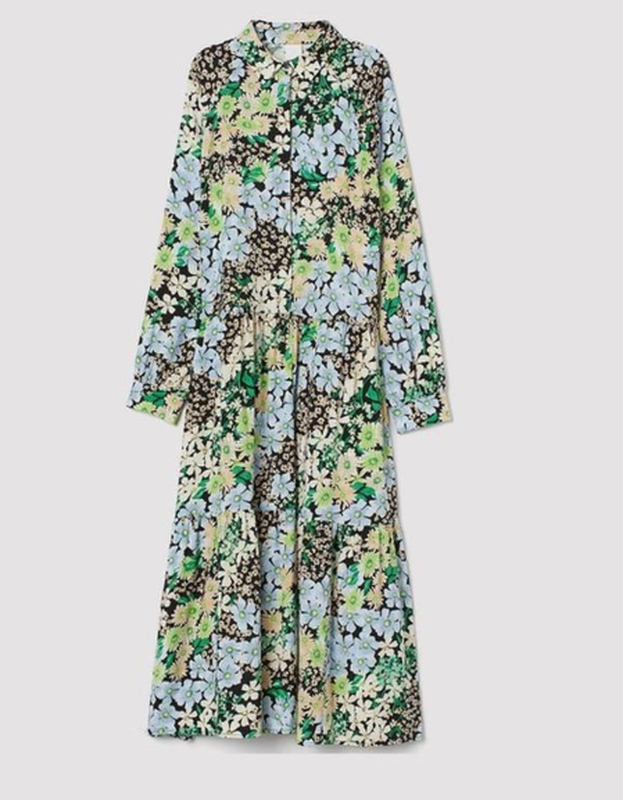 Вискозное миди платье H&M. Ярусный фасон. Отложной ворот. До талии идет на пуговках. Длинный рукав на манжете. Размер хс Длина 115 пог 48 пот 46 поб 70