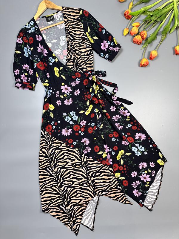 Сукня міді на запах леопардово-квіткова асиметричний низ ✅ Запах регулюється зав'язками ✅ тканина не тягнеться ✅Стан - ідеальний ✅Склад- 100% віскоза ✅Розмір - UK8 EU 36 ✅RECLAIMED VINTAGE Заміри: ПІГ - 47 ПІТ - 35+ регулюється зав'язками ПІБ - 55 Довжина - 110-120