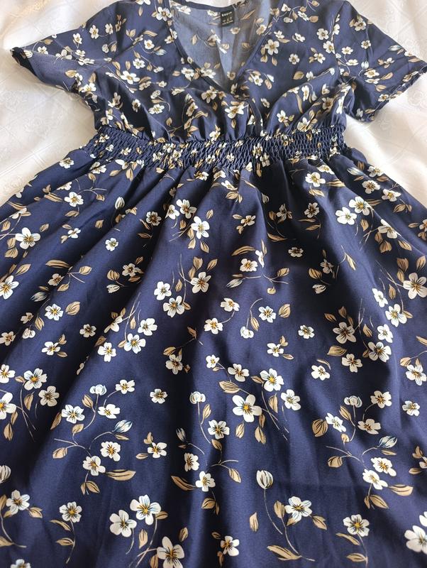 Женское платье из воздушной ткани. Идеальный силуэт подчеркивает фигуру. Резинка на талии и глубокий вырез на комди, создает идеальную форму. Принт с цветками, цвет темно синий. Длина общая 73см Талия на резинке 32см Плечи 38см Длина от плеча до резинки на талии 32см