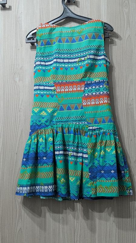 Продается оригинальное женское платье-сарафан без рукавов для летнего сезона. Это идеальный вариант для тех, кто любит яркие цвета и неординарные принты. Платье отлично подойдет для отпуска, пляжного отдыха или летних прогулок. Размер: EUR 36 / UK 10 (соответствует примерно размеру S). Принт: Очень насыщенный, красочный этнический, атмосферский или геометрический орнамент в оттенках бирюзового, зеленого, синего, оранжевого и белого. Детали: V-образный вырез спереди. Особенность – декоративная металлическая молния спереди, тянущаяся от горловины до талии (может быть функциональной или декоративной). Подол выполнен в виде волана (рюши), что придает юбке объем. Материал: Легкая, тонкая ткань (вероятно, вискоза или полиэстер), идеально подходящая для лета.