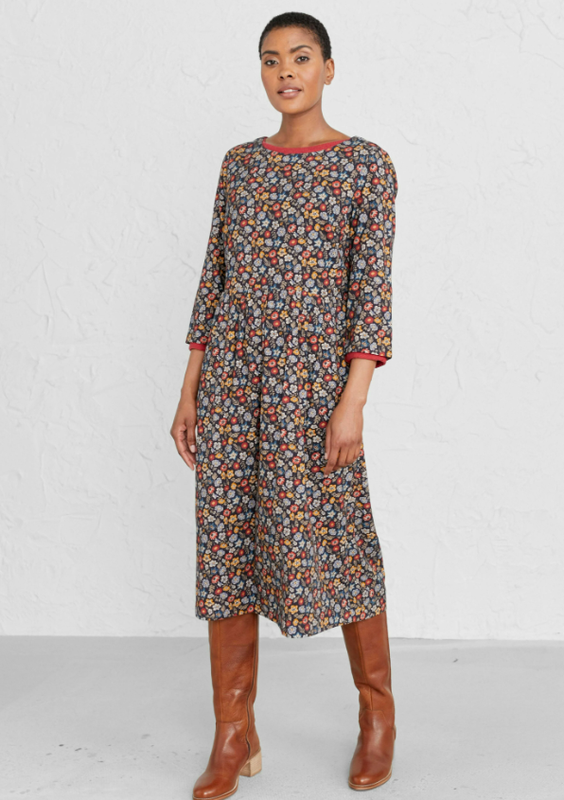 Стильное платье-миди в цветочный принт от известного британского бренда Seasalt Cornwall, модель Kennack Sands (платье названо в честь Кеннак Сэндс – это известный пляж, расположенный на юго-востоке полуострова Лизард (Lizard Peninsula) в графстве Корнуолл, Англия). В 2001 году, после смерти отца, Дона, три брата — Нил (Neil), Лейг (Leigh) и Дэвид (David) Чедвики — решили трансформировать семейный бизнес. Они основали собственный бренд одежды, вдохновленный всем, что они любили в Корнуолле, и назвали его Seasalt (буквально “морская соль”). Миссия заключалась в создании красивой, полезной и качественной одежды, котораяценировала бы дикий ландшафт, цвета и морской дух Корнуола. Женина Нила Чедвика, Софи Чедвик (Sophie Chadwick), дизайнерка текстиля, сыграла ключевую роль в формировании уникального стиля Seasalt. Именно благодаря ее любви к принтам и тканям бренд стал известен своими оригинальными, вручную нарисованными узорами, вдохновленными корнуольской природой. 2005 год: Seasalt стал первой модной компанией, получившей сертификат Soil Association GOTS при использовании органического хлопка. Это подчеркнуло их приверженность к этичному производству и минимизации воздействия на окружающую среду.Сенди Seasalt Cornwall – это один из крупнейших Административов в Корнуолле, который имеет более 70 магазинов в Великобритании и Ирландии, а также развитую международную онлайн-торговлю. Премиальное качество ткани 56% хлопок и 44% вискоза, без синтетики. Ткань прочная и плотная, хорошо держит форму на теле. Основные преимущества такой ткани: - Высокий уровень комфорта: Больше часть состава - хлопок (56%), что делает ткань мягкой, приятной на ощупь и идеальной для чувствительной кожи. - Отличная воздухопроницаемость: хлопок отлично пропускает воздух, позволяя коже дышать. Это делает платье комфортным для ношения в течение всего дня, особенно в теплое время года или в помещении. -Гигроскопичность: Хлопок эффективно впитывает влагу, помогая телу оставаться сухим, что является ключевым преимуществом для повседневной одежды. - Красивая драпировка: Вискоза - это волокно на основе целлюлозы, которое часто имитирует свойства шелка. Она придает ткани текучесть и красивую драпировку. Платье будет иметь элегантный, "спадитый" силуэт, а не жесткую форму. - Мягкий блеск: Вискоза придает ткани легкий, благородный блеск, что делает платье более утонченным, чем изделие из чистого матового хлопка. - Стойкость цвета: Ткани с вискозой хорошо прокрашиваются и сохраняют насыщенность цвета. - Уменьшение сминания: Хотя чистый хлопок сильно мнется, вискоза в смеси помогает уменьшить образование заломов. Платье будет выглядеть опрятнее в течение дня, а глажка будет легче. - Меньшая усадка: В отличие от 100% вискозы, которая может сильно садиться, добавка хлопка делает ткань более стабильной во время стирки. - Легкость: эта смесь обычно легче, чем чистый хлопок высокой плотности, идеально подходящий для летних, вечерних или элегантных офисных платьев. Платье свободного кроя. Круглый вырез горловины. Отрезная линия талии. По талии сборка по юбке. Глубокие боковые карманы (на фото). Рукава длиной 3/4. Рукава широкие. Платье на натуральной подкладке. Подкладка - 100% вискоза. Имеет застежку сбоку в шве подмышкой. Застежка на потайную молнию. Под платье можно надевать однотонный лонгслив (гольф или тонкий джемпер), как это показано на модели или 