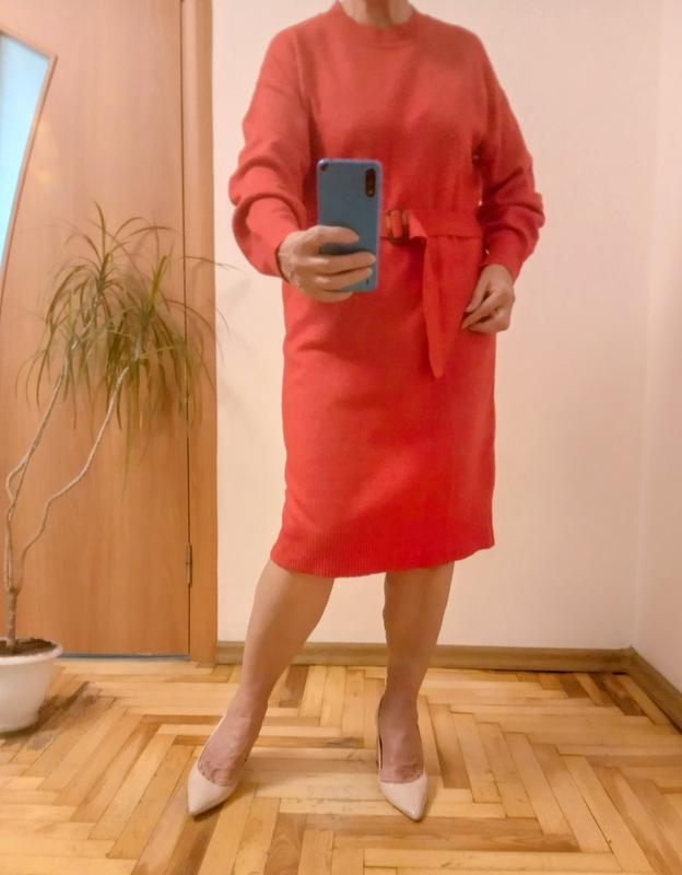 Яркое теплое вязаное платье с поясом. Выглядит стильно. Платье классное. Цвет яркий, красивый, не ядовитый. Состав полиэстер и 33% акрил, ткань приятная, мягкая. Состояние очень красивое. Размер указан 18 Рогн-60, Поб -57 в свободном состоянии, длина рукава от горловины -71, длина -103 см