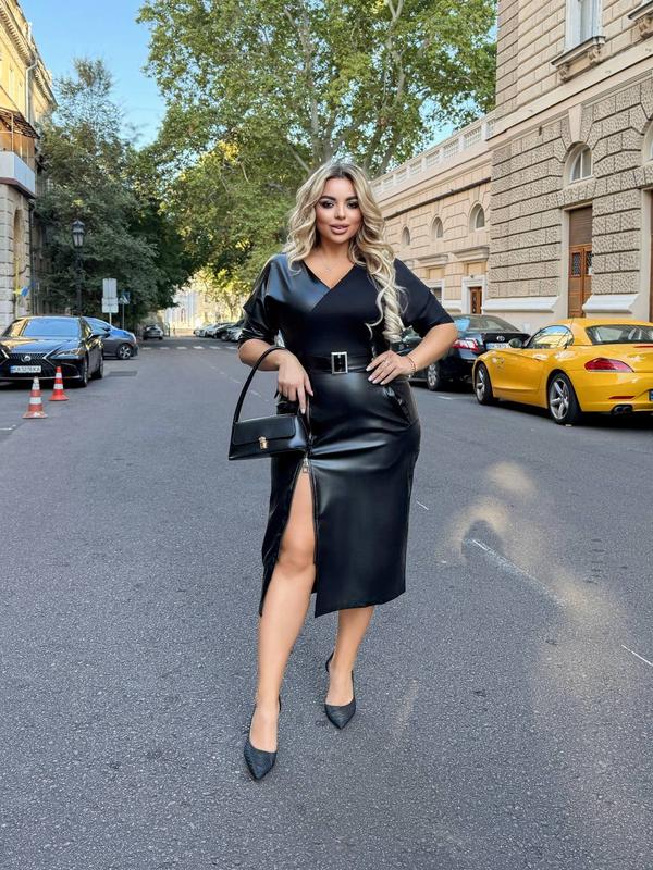 Платье Модель 1117VL Цена : 1250 грн Размеры: 42-44,46-48,50-52,54-56,58-60 Цвета: мокко, синий, черный Ткань : турецкий дайвинг, экокожа (гарного качества) Платье интересного кроя, на груди комбинированная ткань, талия фиксируется съёмным поясом (с пряжкой),рукава объемные ( несколько складок, очень красиво смотрится), по бокам два кармана, рабочая молния от талии до низа Параметры модели-нормы ОГ88, ОТ60, ОБ90, рост 170см, на ней одет размер 42-44; параметры модели-балталл ОГ108, ОТ86, ОБ112, рост 165см, на ней одет размер 50-52. Замеры изделия: РАЗМЕР 42-44: Объем груди 96-100 Объем талии 74 Обʼєм стегон 96-102 Длина рукава от горловины 37 Длина по спинке 114 Длина молния 54 Длина разреза 69 Длина пояса 104 РАЗМЕР 46-48: Объем груди 100-104 Объем талии 80 Обʼєм стегон 100-104 Длина рукава от горловины 37 Длина по спинке 115 Длина молния 56 Длина разреза 69 Длина пояса 115 РАЗМЕР 50-52: Объем груди 114-118 Объем талии 86 Объем бёдер 114-118 Длина рукава от горловины 38 Длина по спинке 120 Длина молнии 56см Длина разреза 70 Длина пояса 125 РАЗМЕР 54-56: Объем груди 118-126 Объем талии 94 Объем бёдер 118-124 Длина рукава от горловины 39 Длина по спинке 124 Длина молния 56 Длина реза 74 Длина пояса 134 РАЗМЕР 58-60: Объем груди 126-132 Объем талии 104-110 Объем бёдер 128- 138 Длина рукава от горловины 40 Длина по спинке 128 Длина молния 56 Длина реза 74 Длина пояса 153