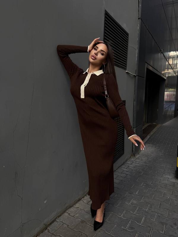 Мінімалістична сукня-поло із приємного до тіла трикотажу . • Розмір універсальний 42-48 Довжина 130 см • Колір: смарагд, чорний, шоколад, молочний • ОГ 80-100 • ОТ 60-84 • ОБ 80-110 8023