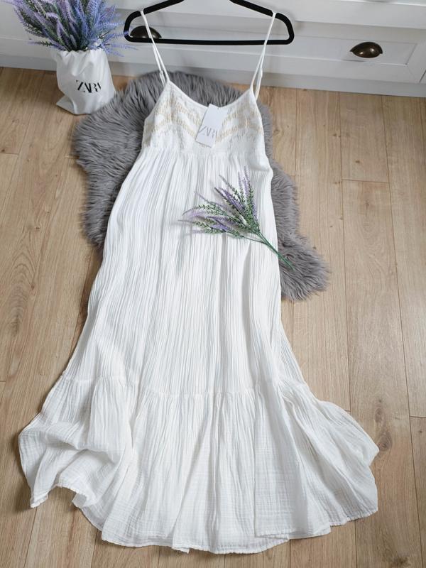Платье средней длины с круглым вырезом и тонкими регулируемыми бретелями. Жатая ткань с контрастной вышивкой. Подкладка. Волани внизу. РАЗМЕР L: ✅ ПОГ -45 см (тянется до 54 см) ✅В талии и бедрах - 67 см ✅ Длина - 131 см ✅Состав: 100% хлопок. Подкладка: 100% хлопок