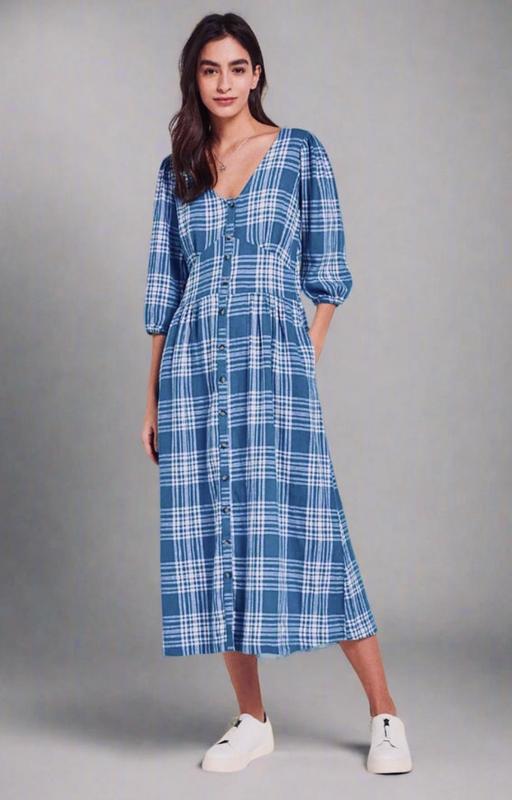 Лен-вискоза! Замечательное платье миди в сине-белую клетку!!! Универсальное платье с прекрасным составом ткани и комплиментарным фасоном!!! Карманы-невидимки в боковых швах, сзади по талии резинка для лучшей посадки по фигуре, застежка сверху донизу на роговые пуговички! Указан размер 12, подойдет на M-L-XL, ориентируйтесь на замеры: Длина от плеча - 113 см Длина рукава - 42 см ПОГ - 50 см ( до 52 см) ПОТ - 39 см (тянется до 46 см) ПОБ - 72 см 29-9-5