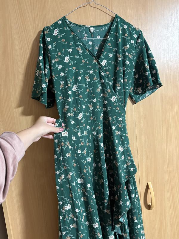 Продам гарне літнє плаття, на запах, зеленого кольору з принтом. Сзаду завʼязується поясом. Сукня в гарному стані. Недолік: в самому низу пропалена дірочка від праски. При бажанні можна заклеїти квіточкою наклейкою або вкоротити сукню /підшити. Розмір L