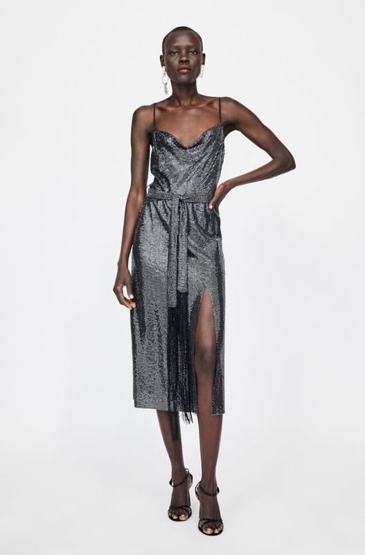 Вечірня котельня сукня з блискучим оздобленням, на тонких бретелях, з поясом, тканина трішки тягнеться Довжина - 126 см (з бретелями) Напів ОГ - 44 см Напів ОТ - 40 см Напів ОБ - 48 см Розріз - 46 см Не вдягали, без бірки