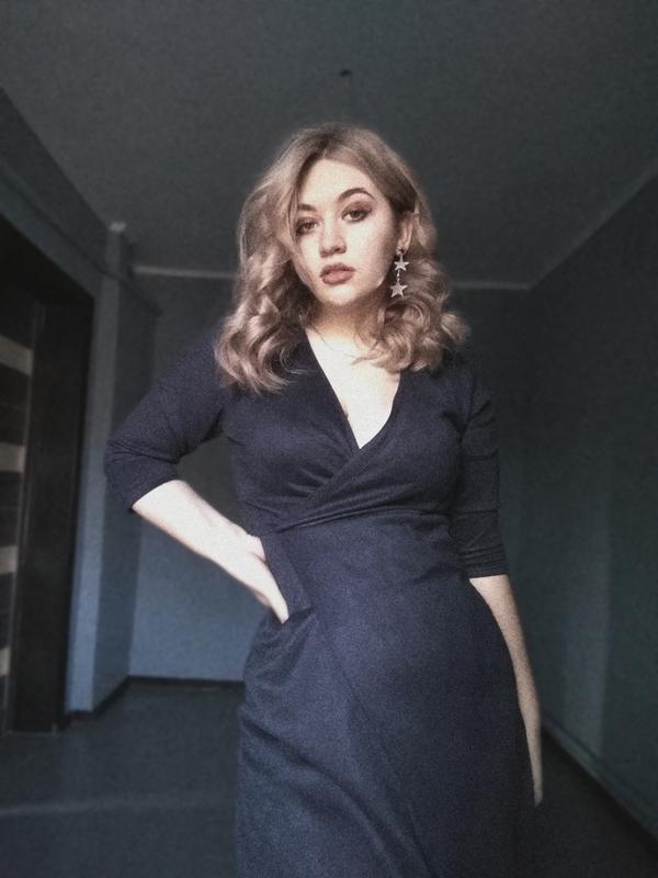 Дуже гарна сукня синього кольору, приємний матеріал (дуже схожий на замшу), має вставку з кружева у розрізі на ногах та гарне декольте. В комплекті ремінець довжина приблизно до середини бедра мій розмір на фото між М та Л, зріст 171