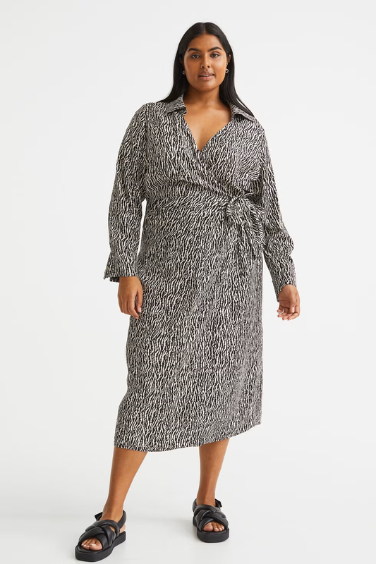 Платье имеет свободный крой, который одновременно современный и удобный. Длинные рукава и V-образный вырез, отложной воротник. Манжеты широкие, застегиваются на пуговицы и имеют разрез. Одна из сильных сторон этого образа — перекрёстный крой, заканчивающийся бантом на талии. Кроме того, благодаря завязке-халату вы можете легко отрегулировать длину, чтобы создать более облегающий силуэт. Этот фасон, без сомнения, один из самых подходящих, независимо от типа вашей фигуры. Чёрно-белый принт напоминает зебру.