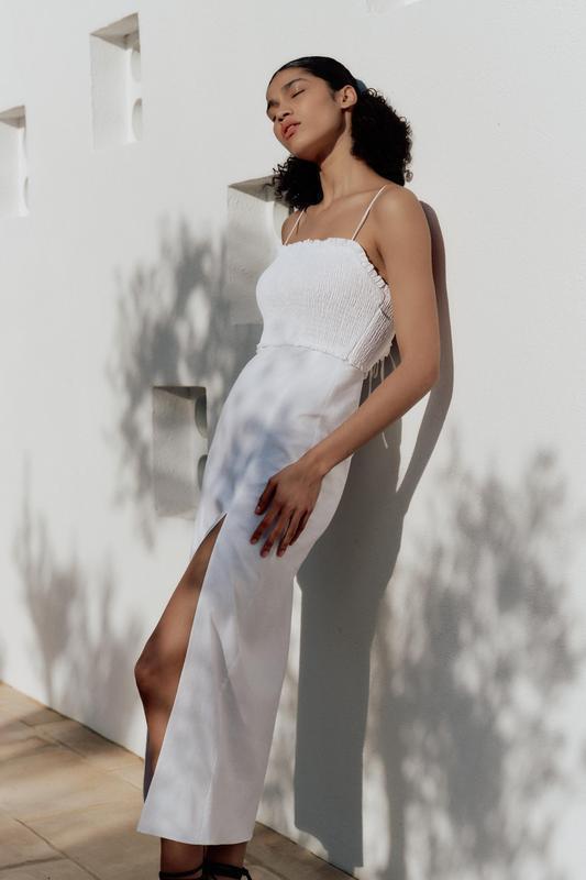 Платье из смеси льна с квадратным вырезом и тонкими бретелями. Эластичная присборенная деталь, разрез снизу. Потайная застежка-молния сбоку. РАЗМЕР М: ✅ НОГ - 35-53 см ✅ НОТ - 32-42 см ✅ НОБ - 49-55 см ✅ Длина - 127 см ✅ Разрез - 57 см ✅Состав: 52% лен, 46% вискоза, 2% эластан