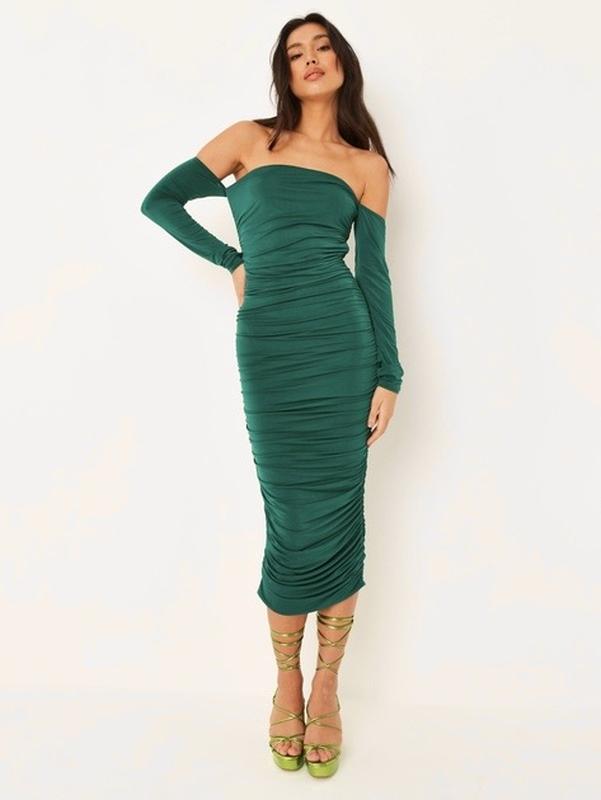 Зелена жіноча сукня міді новорічна пляття з декольте відкриті ключиці облягаюча