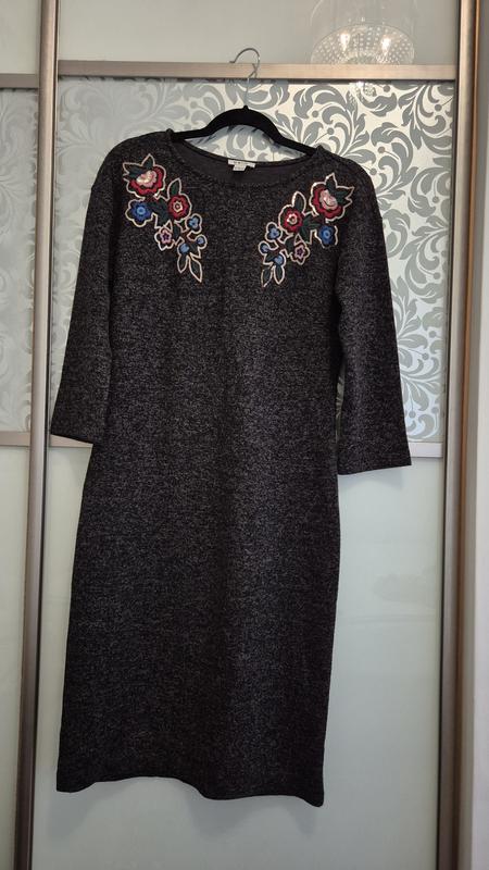 Серое платье с вышивкой пайетками. Имеется сужение на талии, так что хорошо ложится по фигуре.