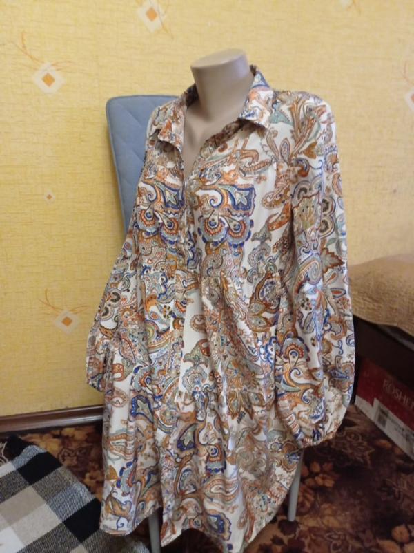 Сток, без бики.Размер 38,М-Л.Оверсайз,форма трапеция.На пуговицах, спереди внизу идет шляпкой.Ткпина идет под шелк,атлас.Очень стильно смотрится.Довжина-86см, ширина между плечами-38см,пог-57см,плечь от воротника-11см,рукав от плеча-1смм