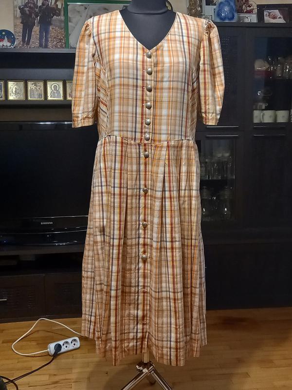 хлопковое платье-халат в клетку, этностиль. Пог 58, плечи 41, рукав 31, длина 108, длина до талии 39, пот 51.