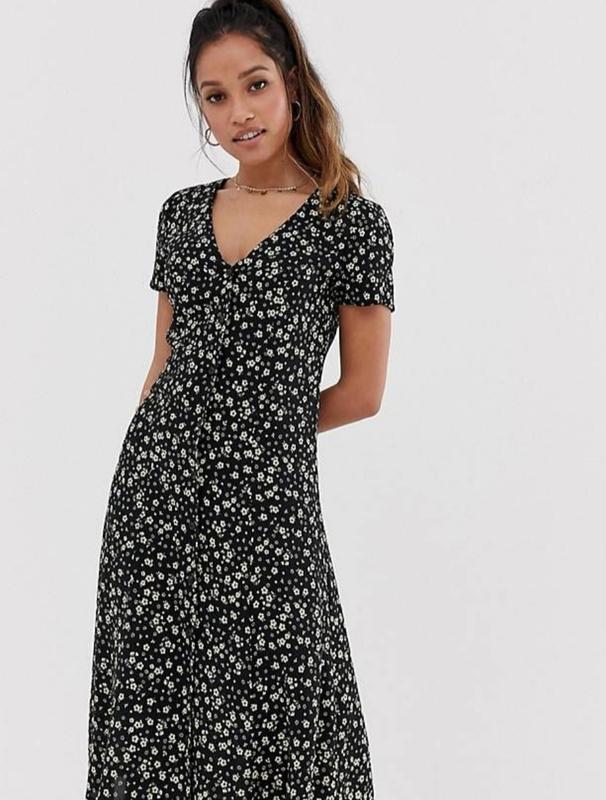 Платье миди на пуговицах, насыщенного черного цвета с цветочным принтом, плечи 38, ПІГ 48-50, ПИТ 43-44, ПИБ 54-55, длина изделия 112.