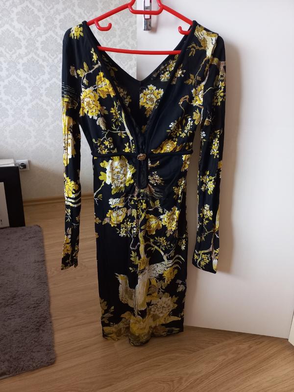 Приталенное платье с красивым декольте, принт - птицы. Очень хорошо тянется. Размер М. Длж 95 Пг 40 Пт 34 Пс 38 Рукав 65