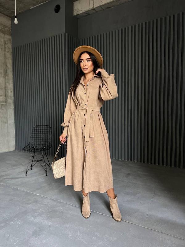 Стильна сукня з вельвету 🧚🏻♀️ 📍Тканина - вельвет; 📍Розміри :42-44,46-48,50-52,54-56 Стильна молодіжна сукня ,в якої ти будеш виглядати стильно і практично .Довжина міді .Одягається під пояс .Застібується на кнопки .Стильний рукав -«Фонарик». Кольори :малина ,чорний ,хакі,беж