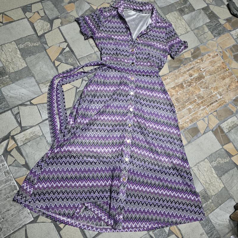 Платье имеет очень эффектный ажурный (сетчатый, кружевной) узор в стиле "Миссони" с использованием фиолетовых, серых, черных и белых оттенков. Основные преимущества: Бренд: Drôle de Copine Paris. Уникальный дизайн: Ажурная текстура, яркий узор, воротник рубашечного типа, короткий рукав и длина миди/макси. Качество: Полностью на легкой шелковистой подкладке (100% полиэстер), обеспечивающей комфорт и непрозрачность. Детали: Металлические золотистые пуговицы по всей длине, подчеркивающие стиль рубашки. В комплекте съемный пояс. Точные Замеры (по нерастянутому изделию): Длина платья (общая): 125 см Ширина в плечах: 37 см Полуобхват груди (ПОГ): 45 см талия регулируется поясом) Полуобхват бедер (ПОБ): 53 см