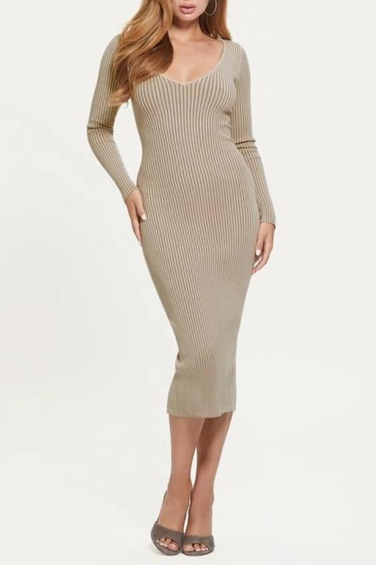 Стильна та елегантна сукня бежевого кольору в рубчик. Облягаючий крій красиво підкреслює фігуру, а м’яка еластична тканина забезпечує комфорт протягом усього дня. Глибокий виріз додає жіночності, роблячи цю модель ідеальною як для повсякденного носіння, так і для виходу, модель з відкритою спинкою. • Колір: бежевий • Довжина: міді • Рукав: довгий • Матеріал: трикотаж у рубчик / еластичний • Стан: нова з етикеткою