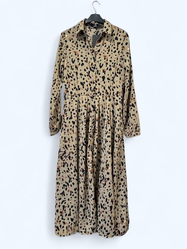 Максі сукня в анімалістичний принт від бренду Love Sunshine Поліестер Розмір вказано С, за рахунок фасону сяде і на М/Л Довжина 128 Плечі 42 Рукав 63 Пог 47 Пот 40 Поб 59 Е 2 прорізні кишені Є петлі для паска