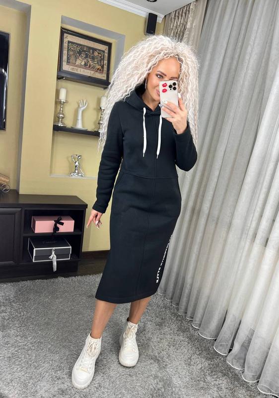 ‼️ОТПРАВЛЕНИЕ ВПРОДОВЖ 2-5 РАБОЧЫХ ДНЕВ!!️ФОТО РЕАЛ ‼️ Женское теплое платье Мягкое и приятное к телу теплое платье на каждый день. Длина макси с разрезами, верх как в худи. Выполнена из 3-х нитки на флисе, снизу украшена принтом надписью. 🔹Материал: Ткань трехнитка на флисе 🔹Размер: 44, 46, 48, 50, 52, 54 Артикул Gold