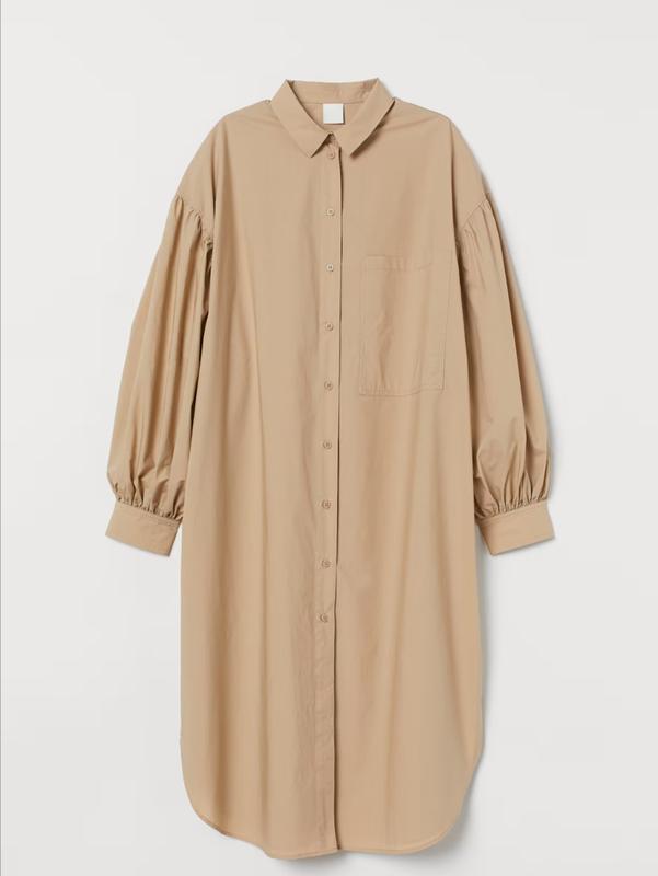 Широкое платье-рубашка длиной до колена из хлопковой ткани. Прямой крой и воротник, застежка спереди. Сильно заниженная линия плеча и длинные объемные рукава с манжетами на застежке. Открытый нагрудный карман и отрезная кокетка со встречными складками сзади для создания дополнительного объема. Скругленный нижний край с высокими разрезами по бокам. Без подкладки. 100% бавовна. Размер М, но смело можно надевать и на L, XL, XXL.