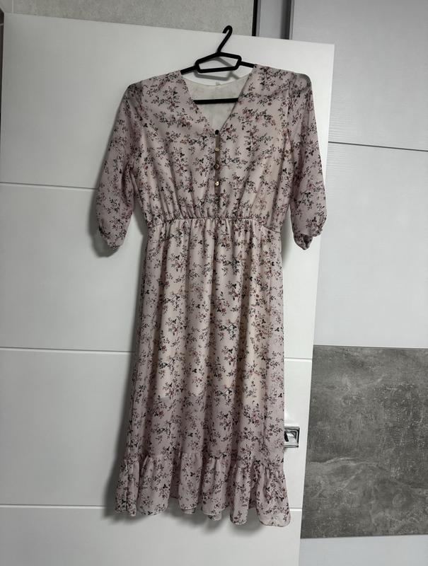 Дуже гарна шифонова сукня рожевого кольору з квітками. Є підкладка. На талії резинка. Також є ґудзики у рівні грудей. Сукня легка та дуже гарна. По довжині - до колін, або трохи вище (в залежності від зросту)
