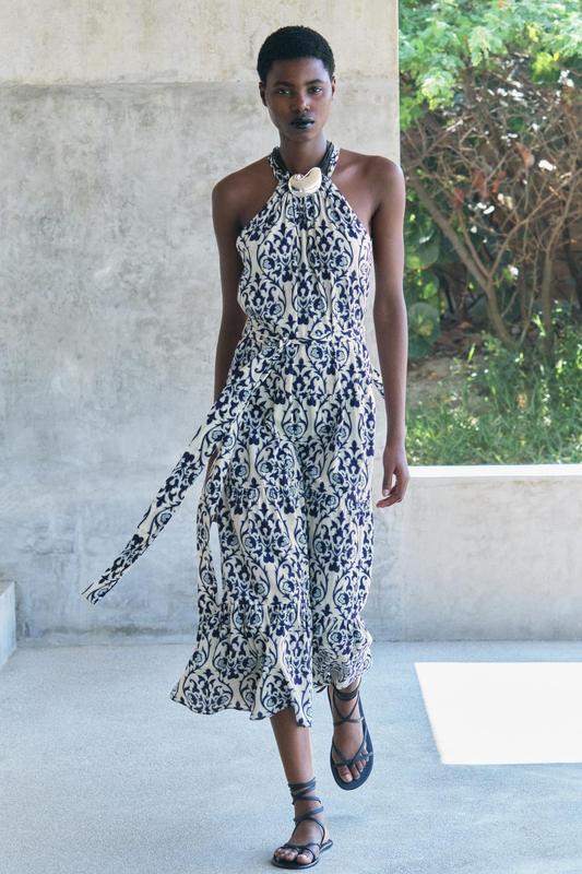 Сарафан с контрастным принтом, воротником хальтер, открытыми плечами, завязывающимся пояском из той же ткани и воланом по низу. 100% бавовна. По бірці М-ка. Длина по спине 127см Объем груди полуобхват 50см Талия 43см Стегна 59см