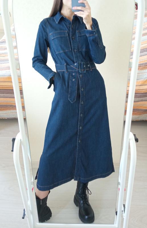 Джинсовое платье миди с поясом. Состояние отлично. Котон тонкий, тянется. Застежка пуговицы спереди. По бокам разрезы. Есть карманы. Размер 34-36. 99% котон, 1% еластан Длина 118см Рукав 59см Плечи 35см Пог 45-46см Пот 37см Поб 46-49см Повна оплата на карту!!