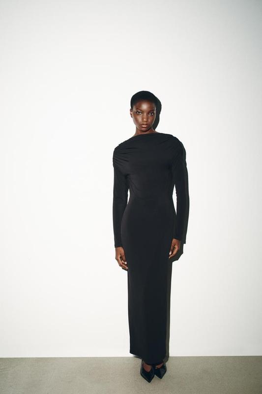 Сукня середньої довжини з високим коміром і драпірованою тканиною на плечах. Довгі рукави. Деталь декольте на спині. Застібка на схрещену смужку з регульованими металевими ланками з карабіном і підвіскою-прикрасою. ЧОРНИЙ | 5063/289/800